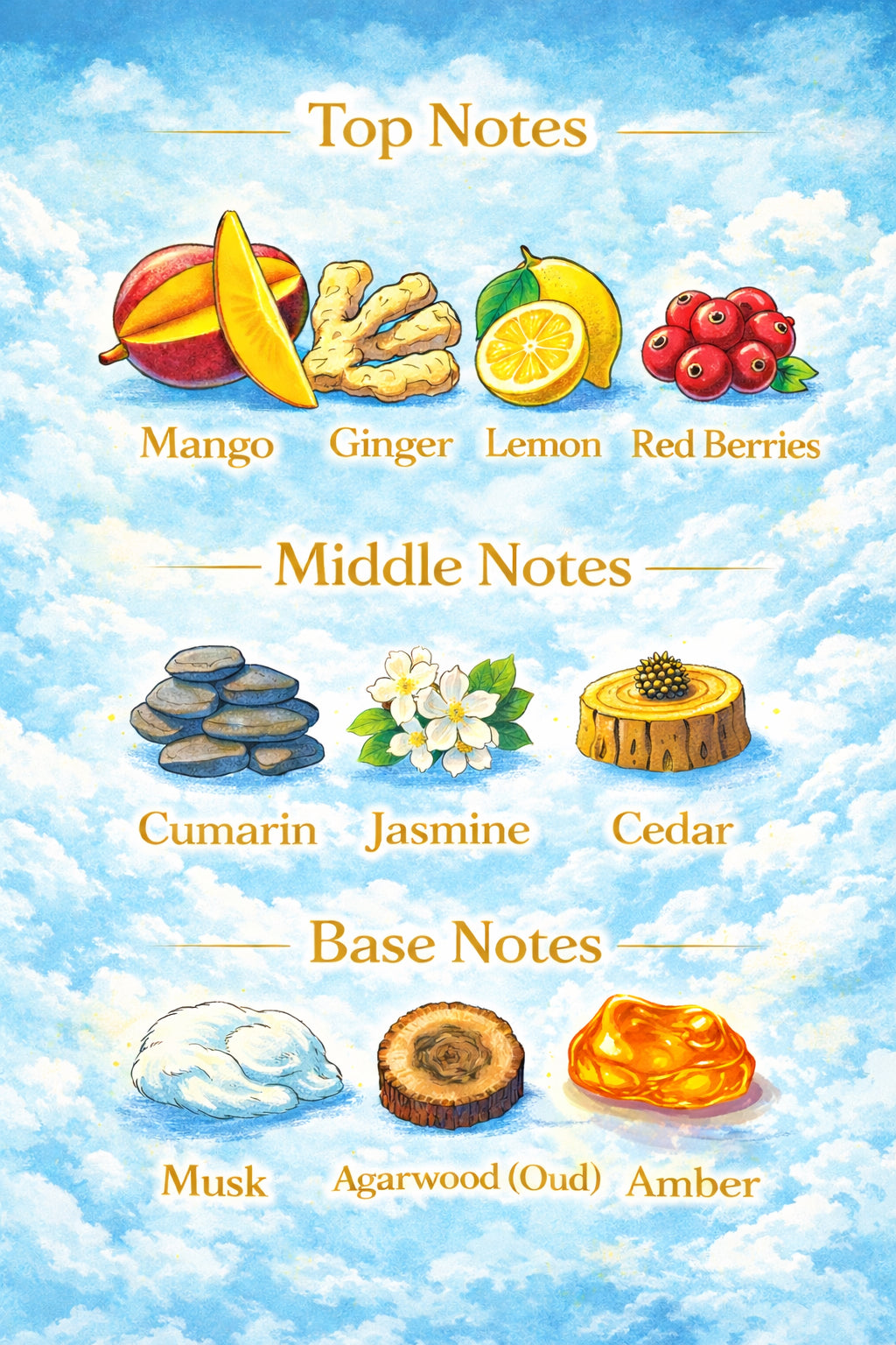 God of Fire is a vibrant, energetic fragrance built around bright mango, citrus, and fresh woods. It opens with a lively burst of fruit and sparkling freshness, followed by a clean, crisp aromatic heart. The dry-down reveals smooth woods and gentle musks, giving the scent a balanced blend of tropical sweetness and modern sophistication.
